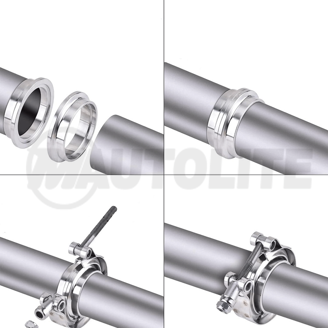 Fabricado en acero inoxidable 304, resistente a la corrosión, alta temperatura y presión. Incluye: 1 abrazadera de banda en V + 1 brida macho + 1 brida hembra.