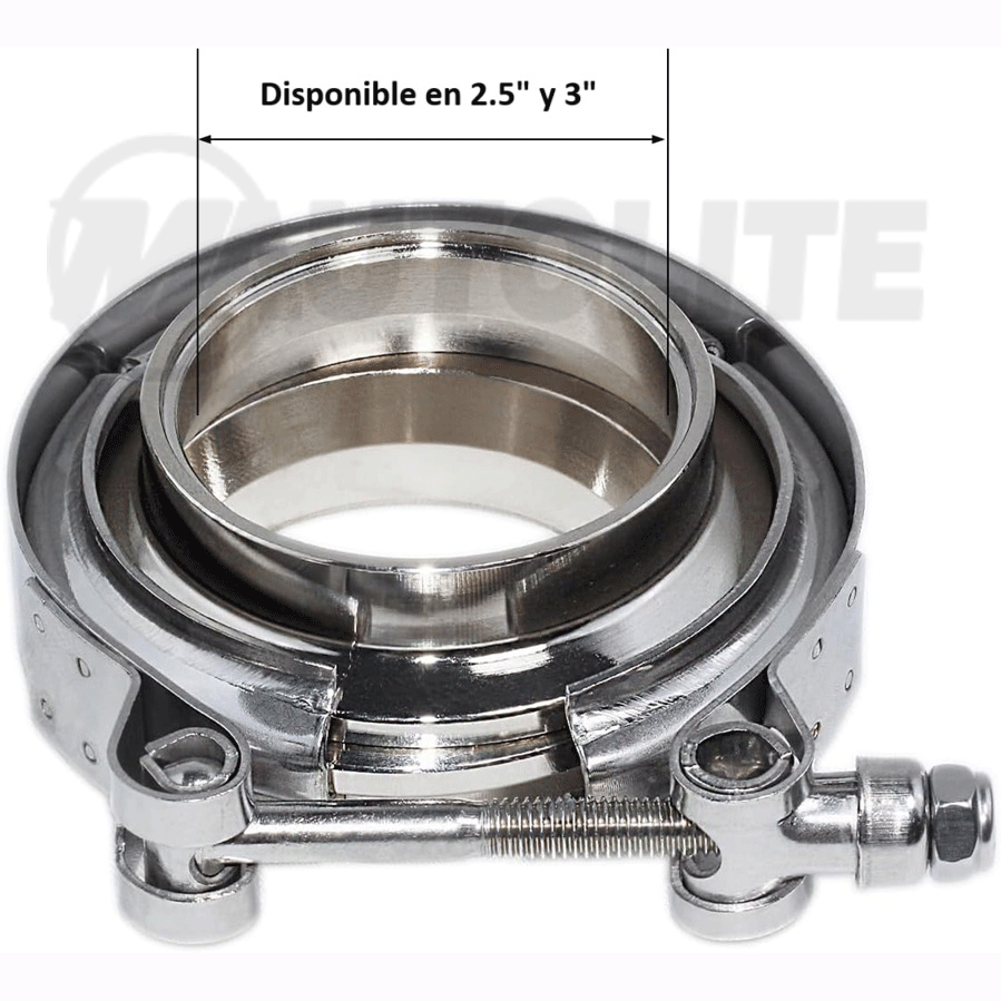 Kit de abrazadera de banda en V con bridas macho y hembra de acero inoxidable, ideal para sistemas de escape de alto rendimiento: turbo, catback, bajantes y más. Permite un sellado sin fugas sin necesidad de juntas, y facilita el montaje y desmontaje rápido del escape.