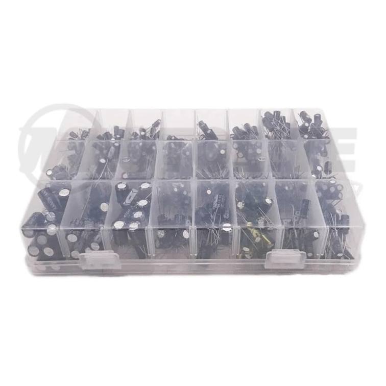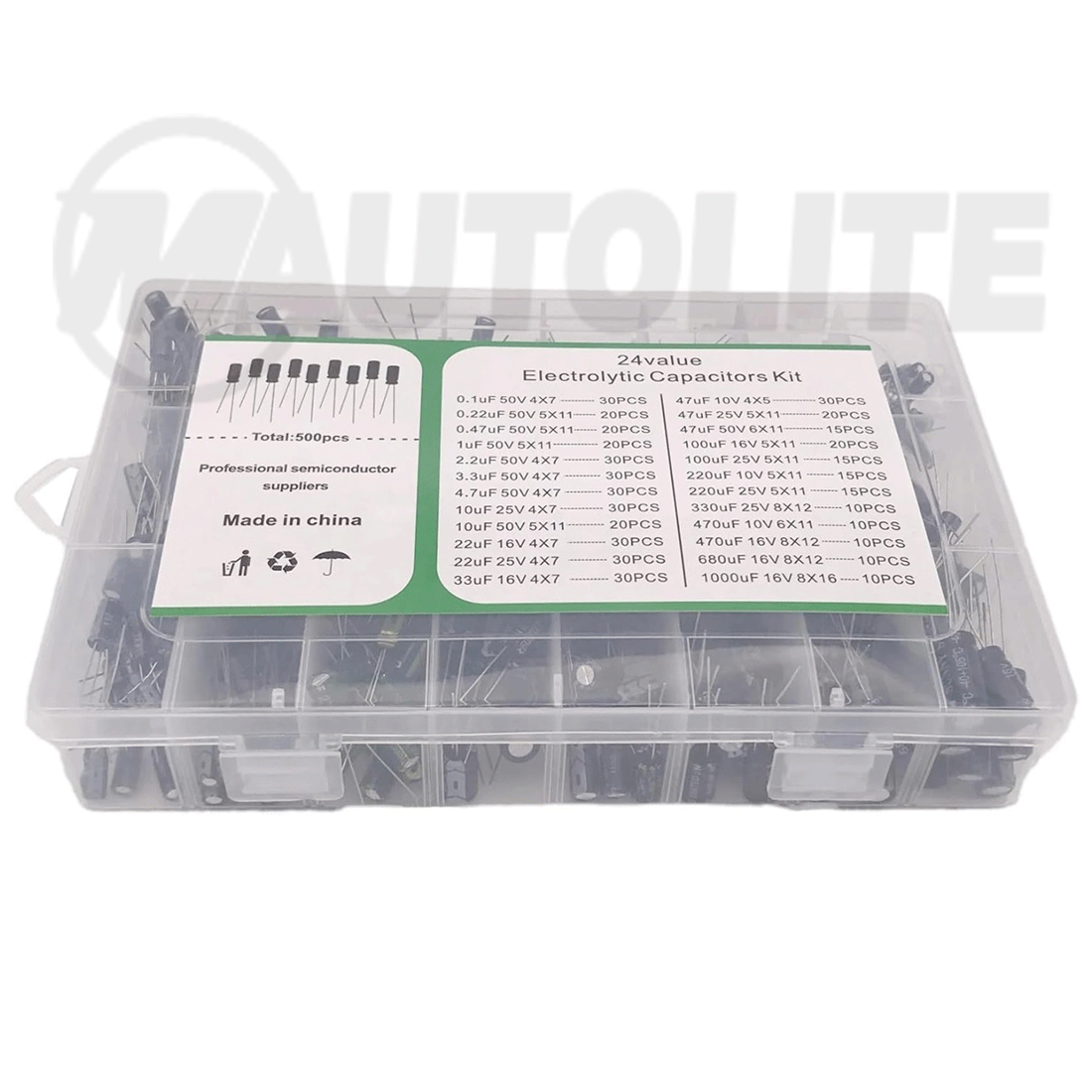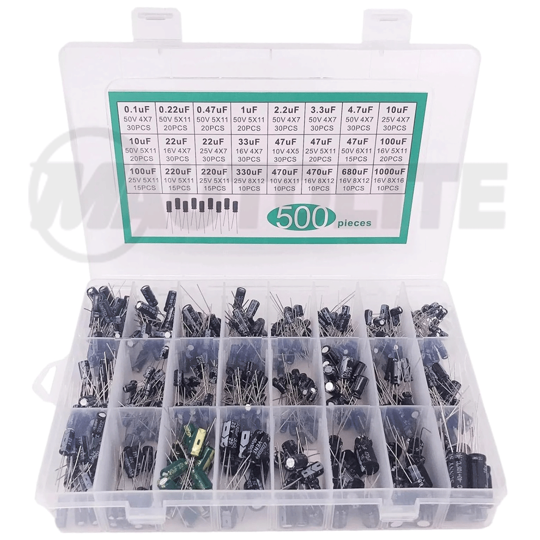 Kit surtido de 500 capacitores, incluye 24 valores diferentes de 0.1μF a 1000μF con voltajes de 16V a 50V.