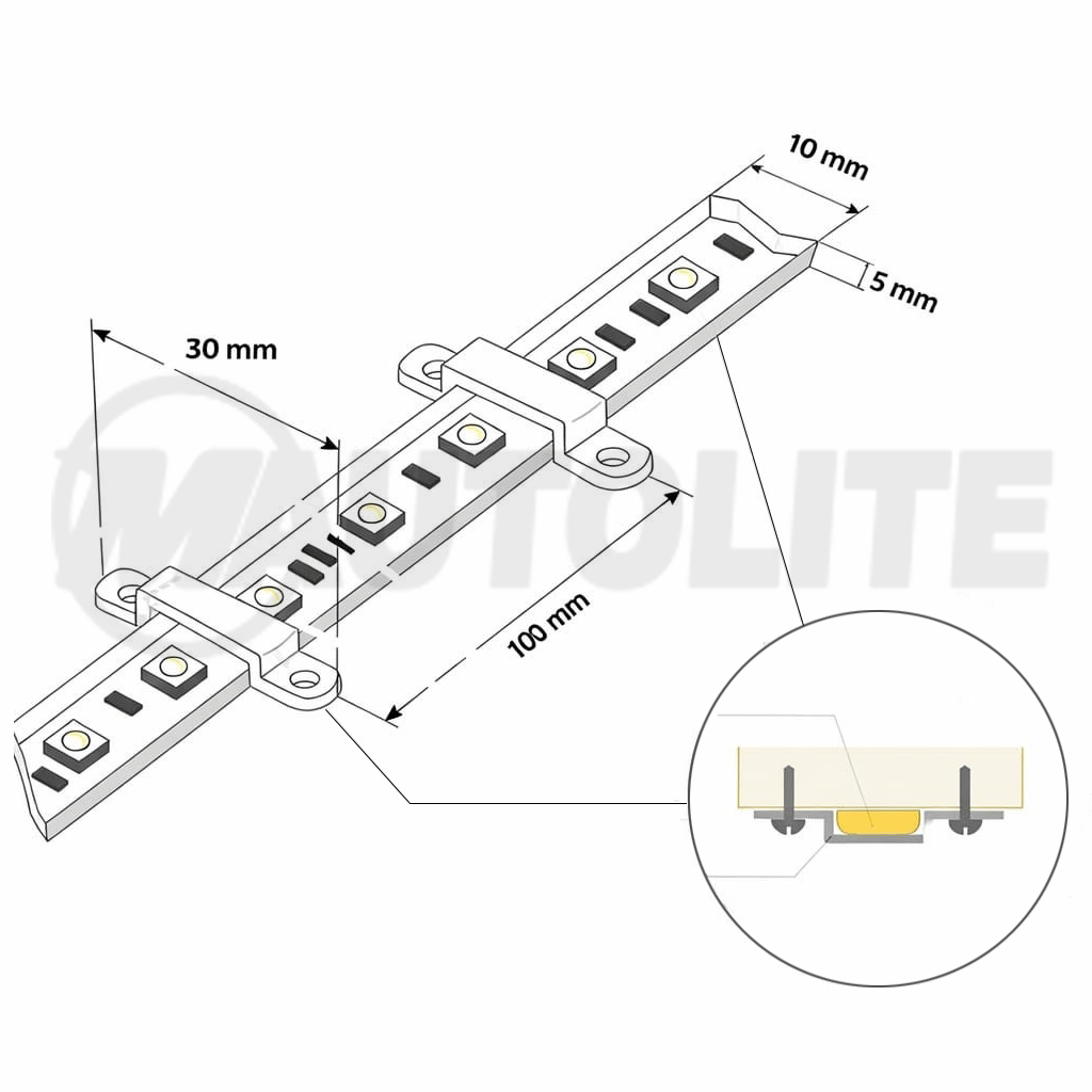 Práctico clip de silicona para fijar tiras LED de 110V, 12V, 24V o RGB de forma segura y ordenada, manteniendo tus luces firmes y bien alineadas.