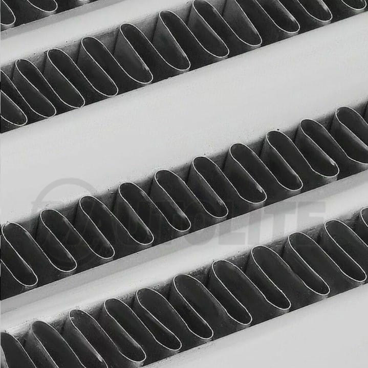 El material es 100% aluminio y mide 17.5” de largo x 10.5” de alto y 3” de grosor, son las medidas exactas del enfriador sin estructura.