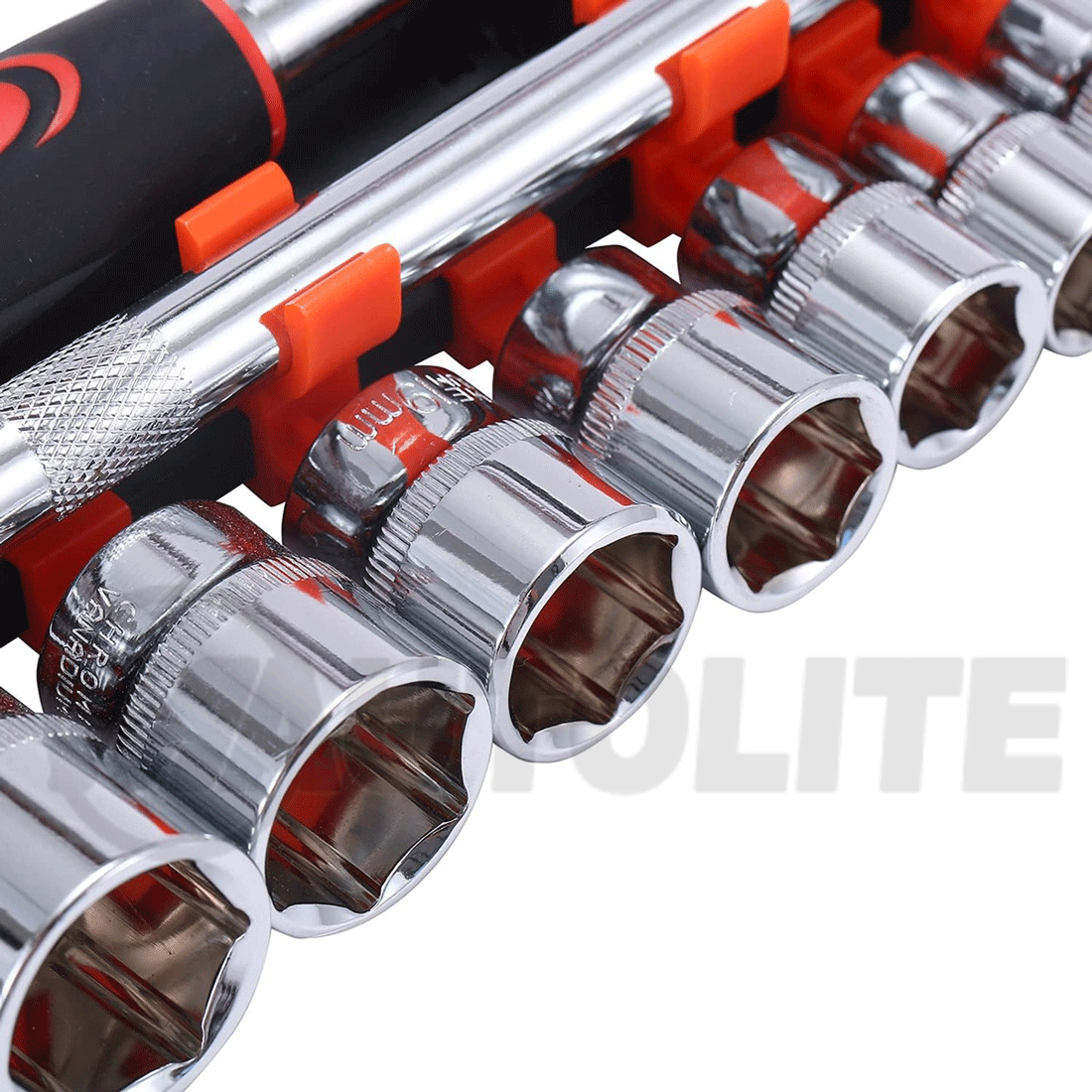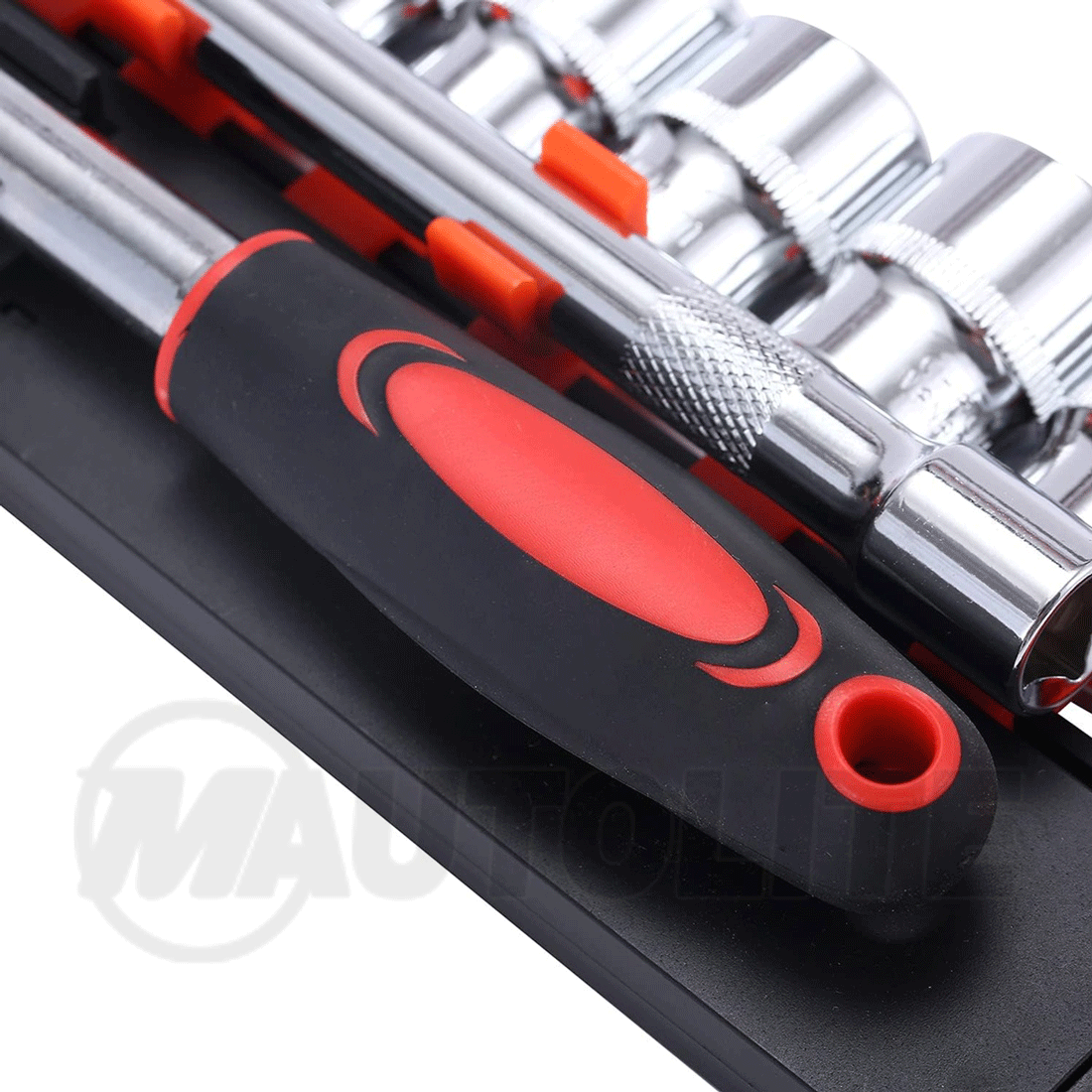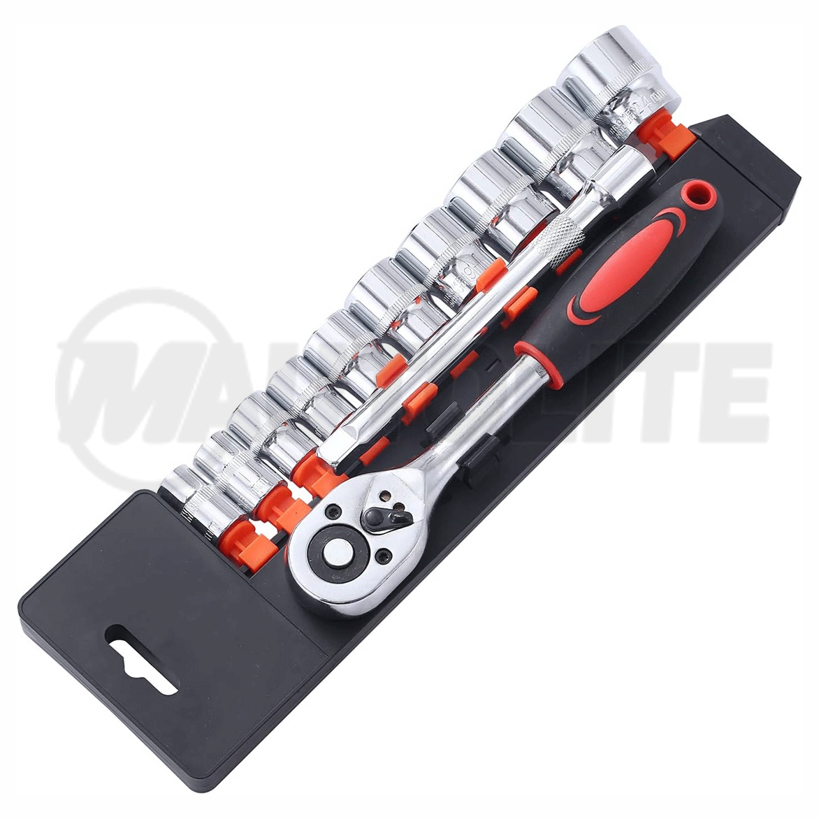 Set de 12 piezas ideal para trabajos mecánicos y uso general. Incluye 10 copas métricos de 8mm a 19mm fabricados en acero Cr-V de alta resistencia, más mango ratchet de liberación rápida y barra de extensión. Cada pieza está marcada para fácil identificación. Práctico, duradero y perfecto para cualquier taller o uso en casa.