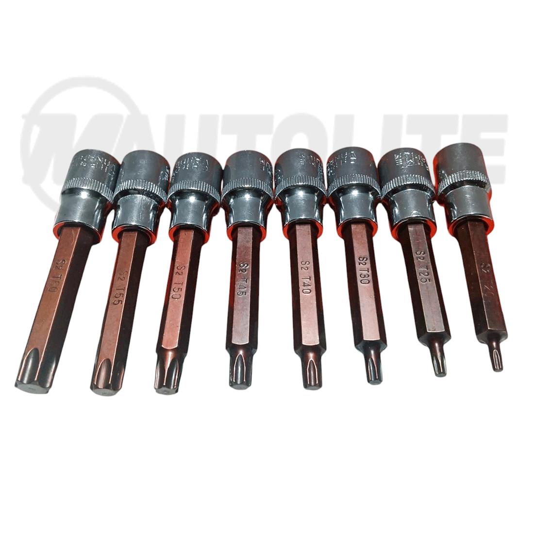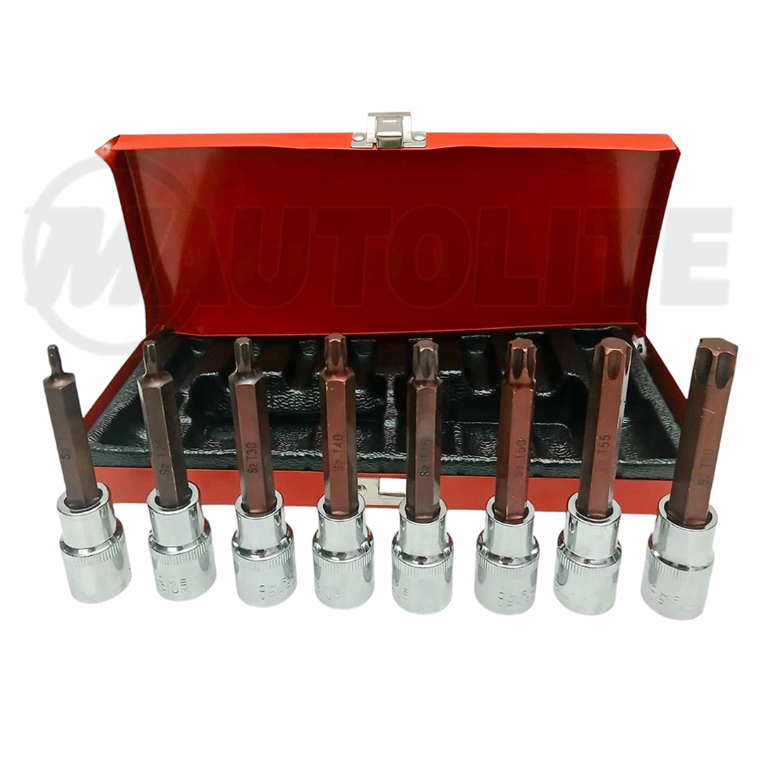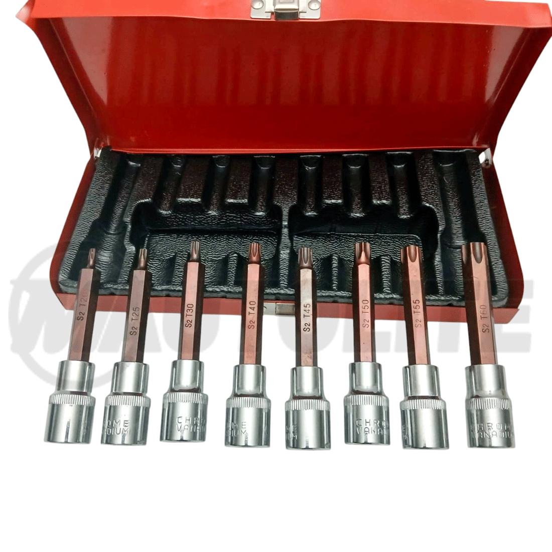 Juego de copas de 1/2″ con punta Torx larga, incluye 8 medidas en caja metálica resistente.