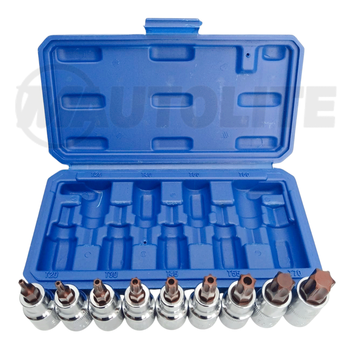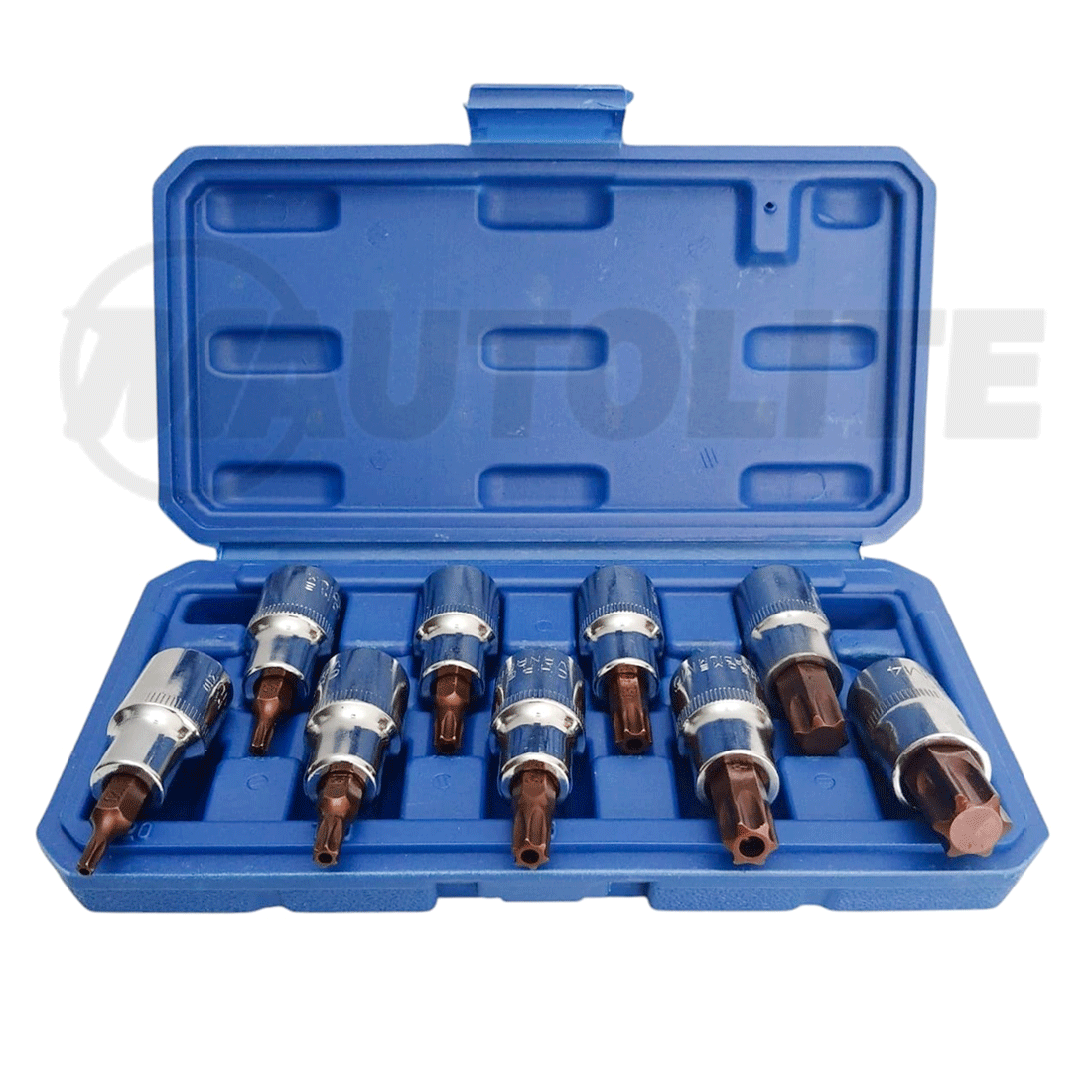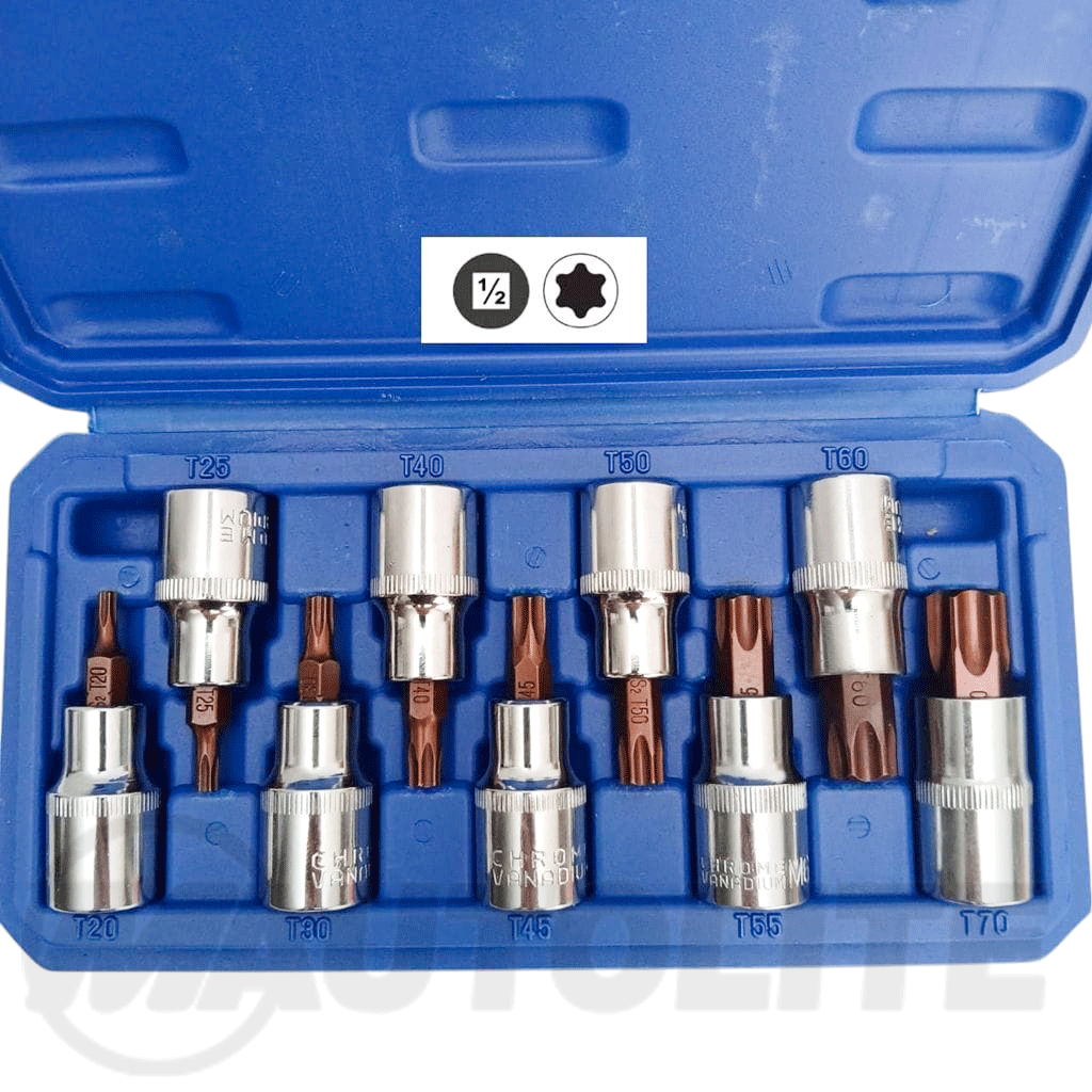 Set de 9 copas Torx T-Star macho de 6 puntas con agujero central y raíz de 1/2″, ideal para tornillos de seguridad en autos europeos como VW, Audi, Porsche, BMW y Mercedes. Herramienta de alta calidad, resistente y precisa para uso mecánico o profesional.