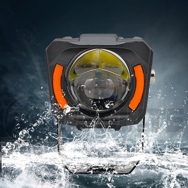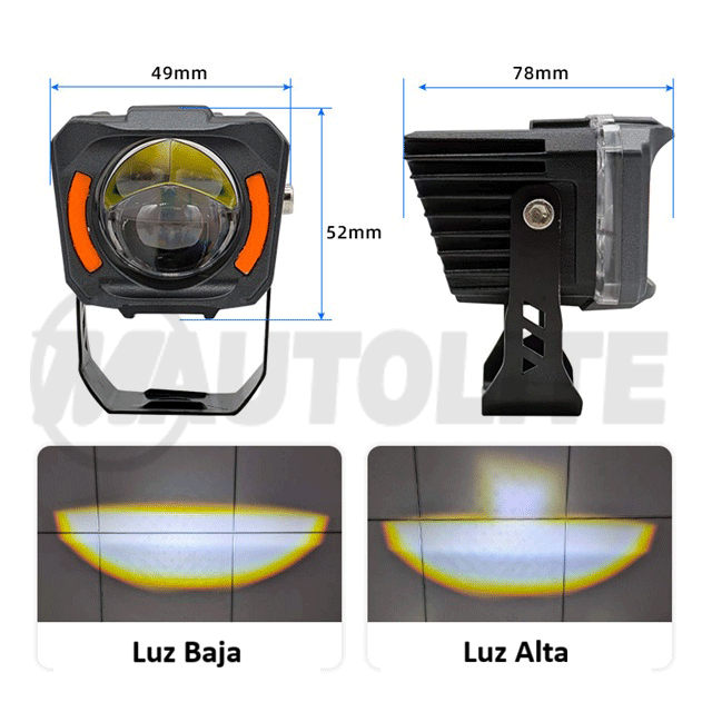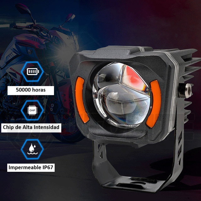 Neblinera LED Amarillo/Blanco tipo proyector con diseño moderno y ojos de diablo, ideal para motocicletas, carros y vehículos todo terreno. Su lente concentrado ofrece una luz potente y de largo alcance, mientras que su diseño robusto y deportivo le da un toque agresivo a tu vehículo.