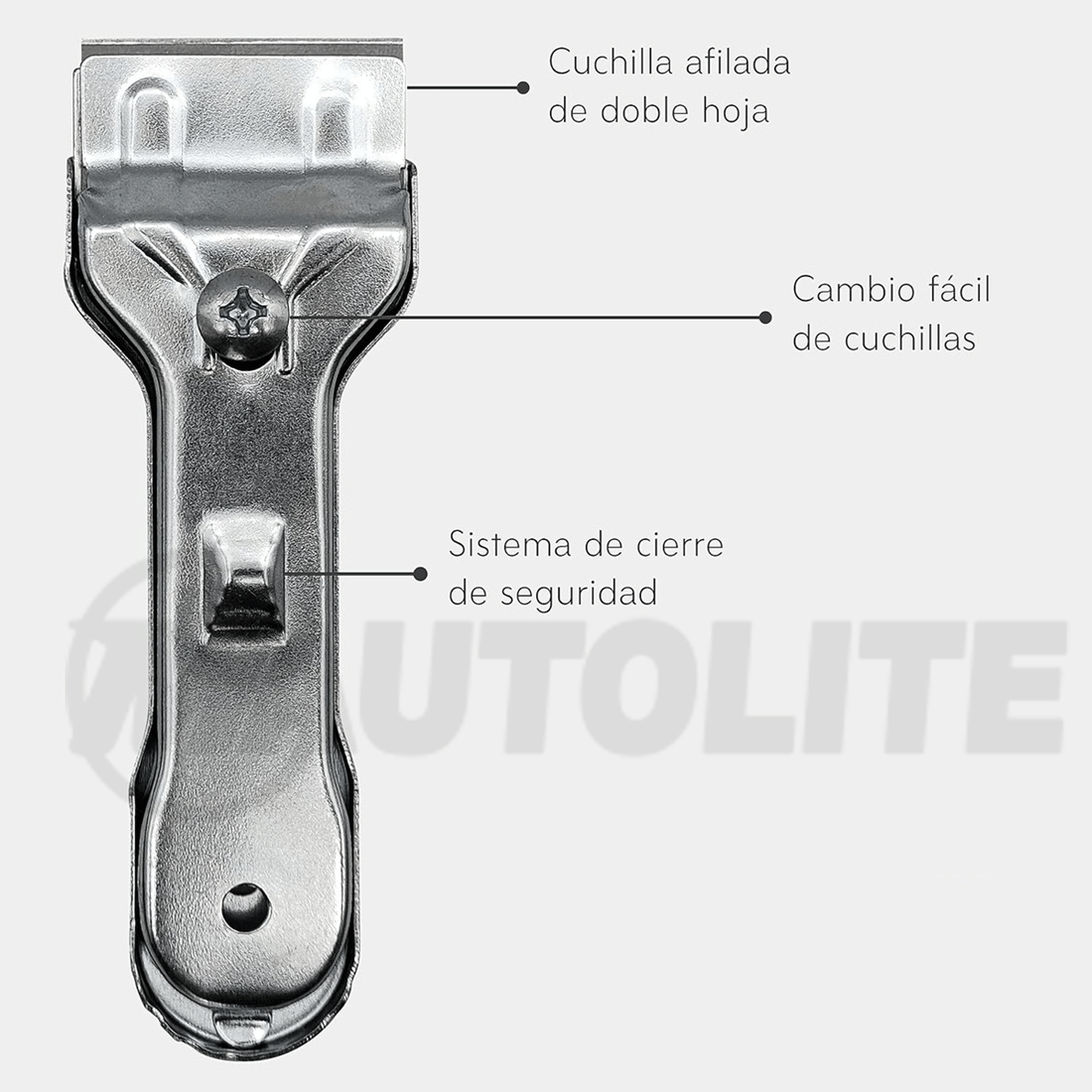 El raspador ya viene con su respectiva cuchilla de 2 lados de filo tipo Gillette y es fácil de reemplazar con cualquier marca de Gillette convencional.