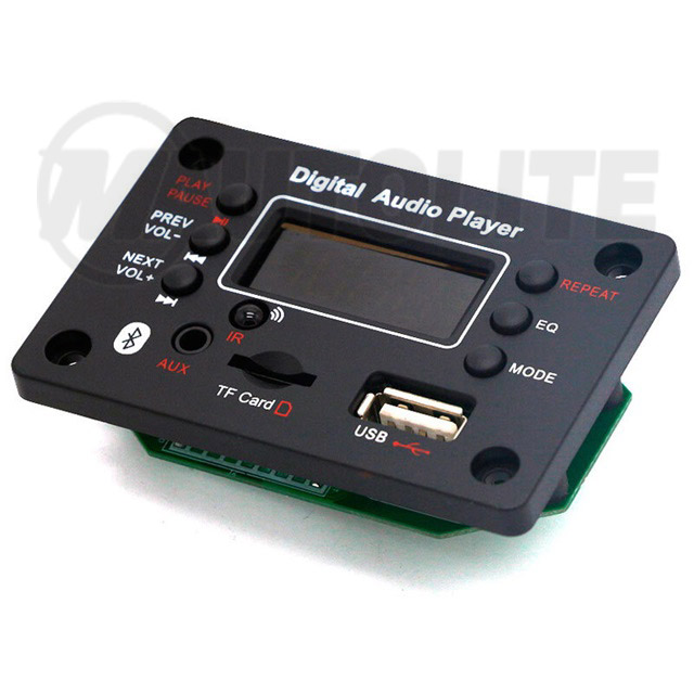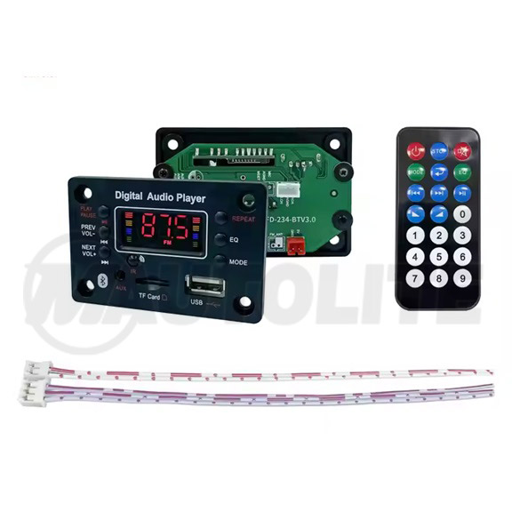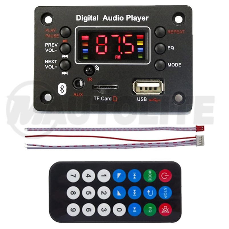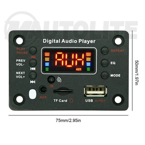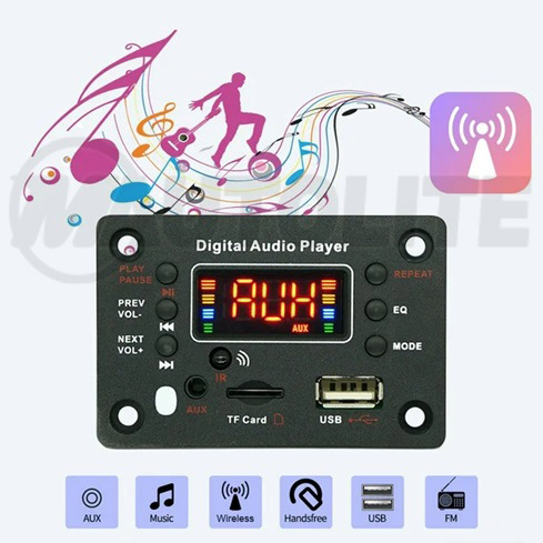 El modulo es un avanzado decodificador de audio MP3 con pantalla a color digital y conexión Bluetooth, ideal para actualizar tu sistema de audio. Con salida de baja impedancia, garantiza una señal clara y compatible con amplificadores.